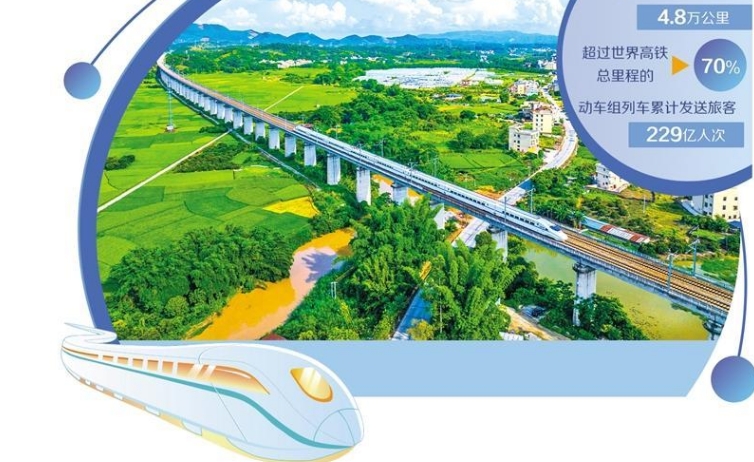 动车组从广西梧州市龙圩镇念村的田野上飞驰而过。何华文摄(中经视觉)   今年是世界铁路诞生200周年。  &emsp