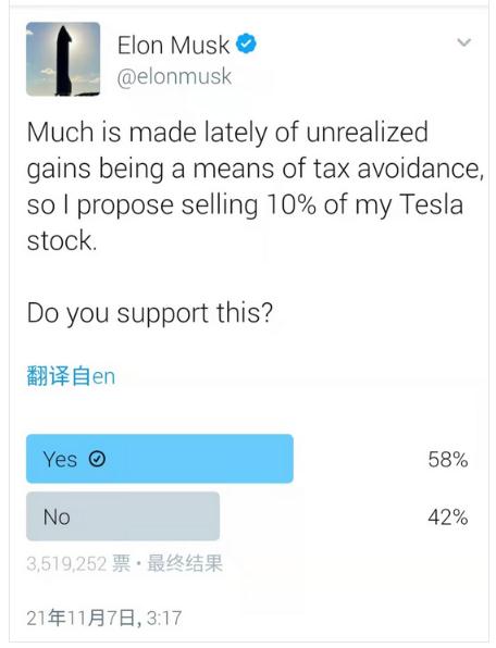 11月7日凌晨3点17分,特斯拉CEO马斯克在Twitter发起了一项24小时的投票意见征询,表示:“最近有很多人认为未实现收益是一种避税手段,所以我建议出售10%的特斯拉股票。你们是否支持这项提议?”