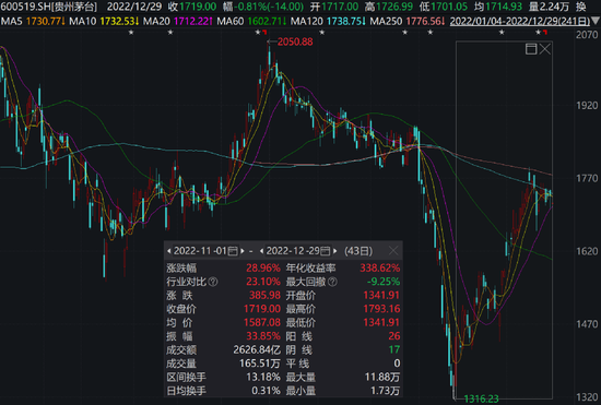 同时,今年公司生产茅台酒基酒5.68万吨左右,系列酒基酒3.50万吨左右。从股价表现来看,尽管茅台今年整体跌超14%,但11月以来其出现一波反弹,最新报收1719元/股,总市值为2.16万亿元。
