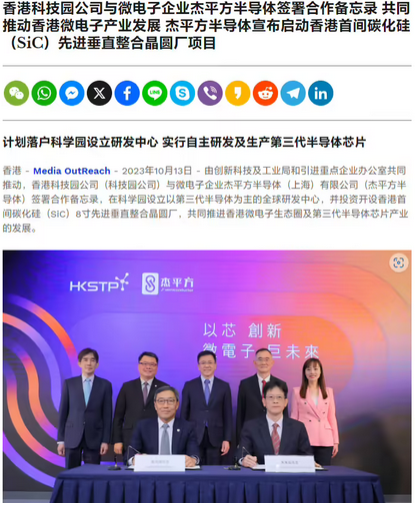 杰平方董事长俎永熙介绍,签署合作备忘录标志公司在香港正式启动第三代半导体碳化硅 8 寸先进垂直整合晶圆厂项目计划。该项目总投资额约 69 亿港币(IT之家备注:当前约 64.45 亿元人民币),计划到 2028 年年产 24 万片碳化硅晶圆,带动年产值超过 110 亿港币(当前约 102.74 亿元人民币),并创造超过 700 个本地和吸引国际专业人才来港的就业岗位,包括芯片、微电子产品设计、微电子模组化及生产流程发展等。